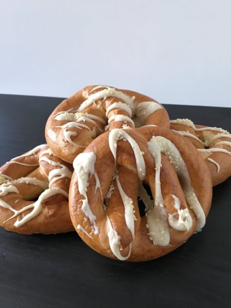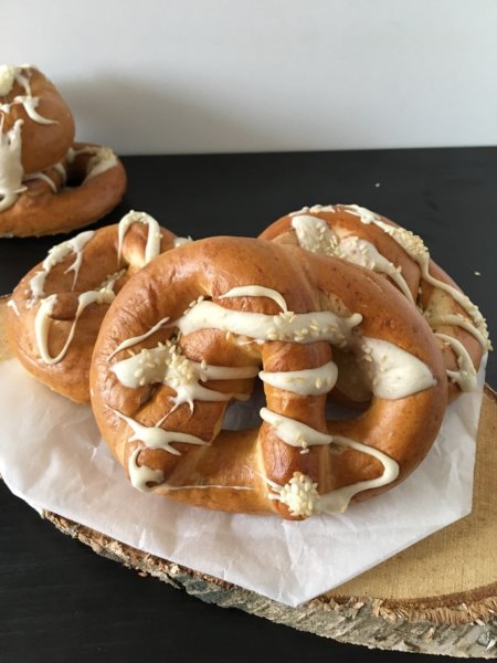 Hagyd pihenni a pereceket 15 percig, addig melegítsd elő a sütőt 210 fokra. Süsd 12 percig, ezalatt készítsd el a sós öntetet. A lisztet a sóval keverd el és óvatosan adagolj hozzá vizet. A lényeg, hogy tejföl sűrűségű legyen. Ahogy lejárt a 12 perc, kend meg a sós öntettel (ekkor én megszórtam szezámmaggal is) és tedd vissza még 4-5 percre. Figyelj arra, hogy a sós öntet ne barnuljon meg.