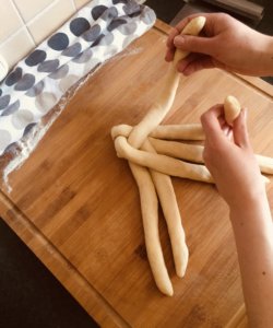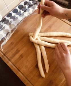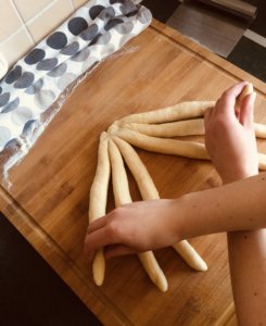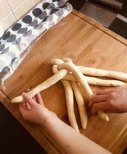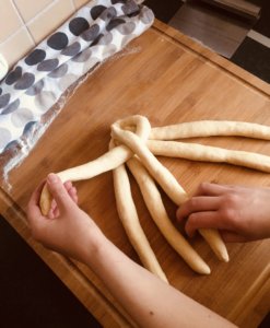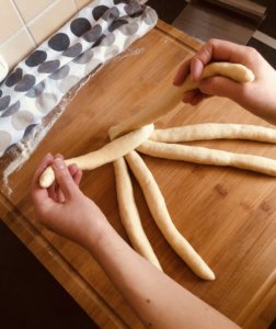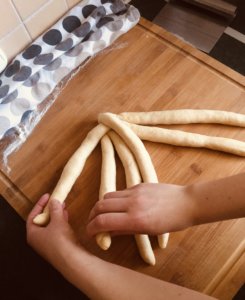 A lényeg, hogy először keresztbe tesszük a kezünket és a két szélső rudat megfogjuk. Keresztezzük őket, tehát a kezünk már nincs keresztben. Aztán a jobb kezünkben lévő tésztát letesszük baloldalra belülre. Ugyanezzel a kezünkkel a bal oldalt megfogjuk a legszélső tésztát. Keresztezzük a két tésztát, amik a kezünkben vannak és most a bal kezünkben lévő tésztát tesszük le jobb oldalra belülre. Ugyanezzel a kezünkkel megfogjuk a jobboldali legszélső tésztát. Folytatva ezt addig, amíg el nem fogy a tészta. Jó alaposan lenyomkodjuk a tésztavéget és betesszük alá. Néhányszor áthengergetjük.