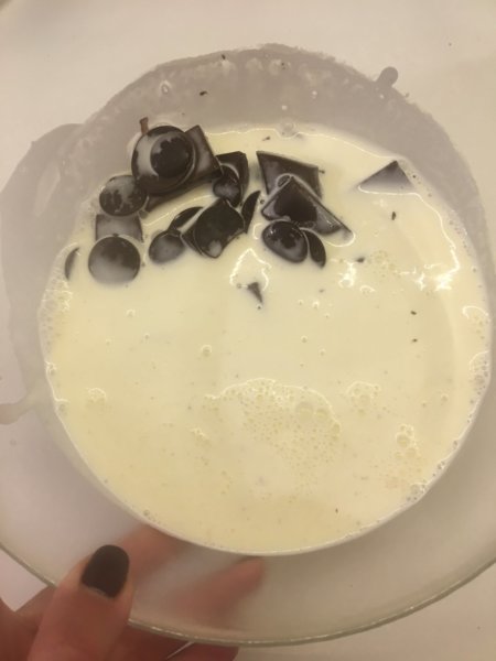 Addig is elkészítjük a ganachet. A konzerv kókusztejszínnek csak a sűrűjét használd. A tejszínt felmelegítjük lábasban, addig amíg éppen, hogy nem forr. A feldarabolt csokira öntjük és egy picit állni hagyjuk, majd összekeverjük. Hűtőbe rakjuk, hogy megdermedjen.